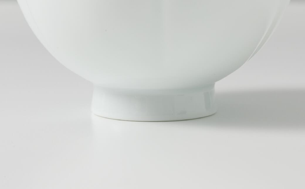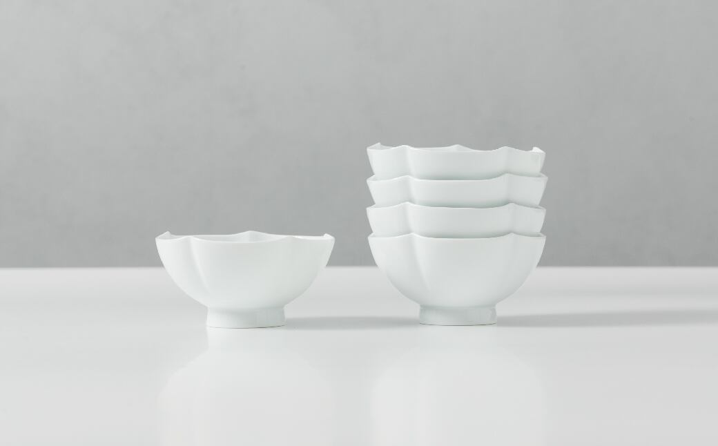 重要無形文化財「白磁」保持者(人間国宝)、井上萬二さんが営む井上萬二窯の作品です。染付や色絵などの加飾が盛んな有田焼の中で、井上さんは「焼物の良さは形にある」という信念の下、加飾を施さない白磁の造形美を極めた作家として知られています。使い勝手の良い小鉢にも端正なロクロの技が見て取れ、緩やかな5枚の花弁形に技術の高さがうかがえます。