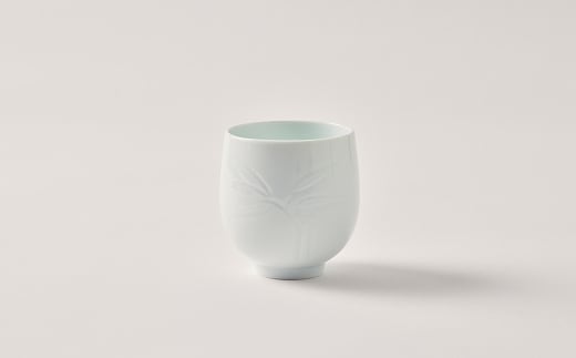 純白の白磁に笹の紋様が躍動的に彫り込まれた、美しい湯呑。笹の文様は、長寿のイメージを持つ吉祥文様として、古くから愛用されてきました。