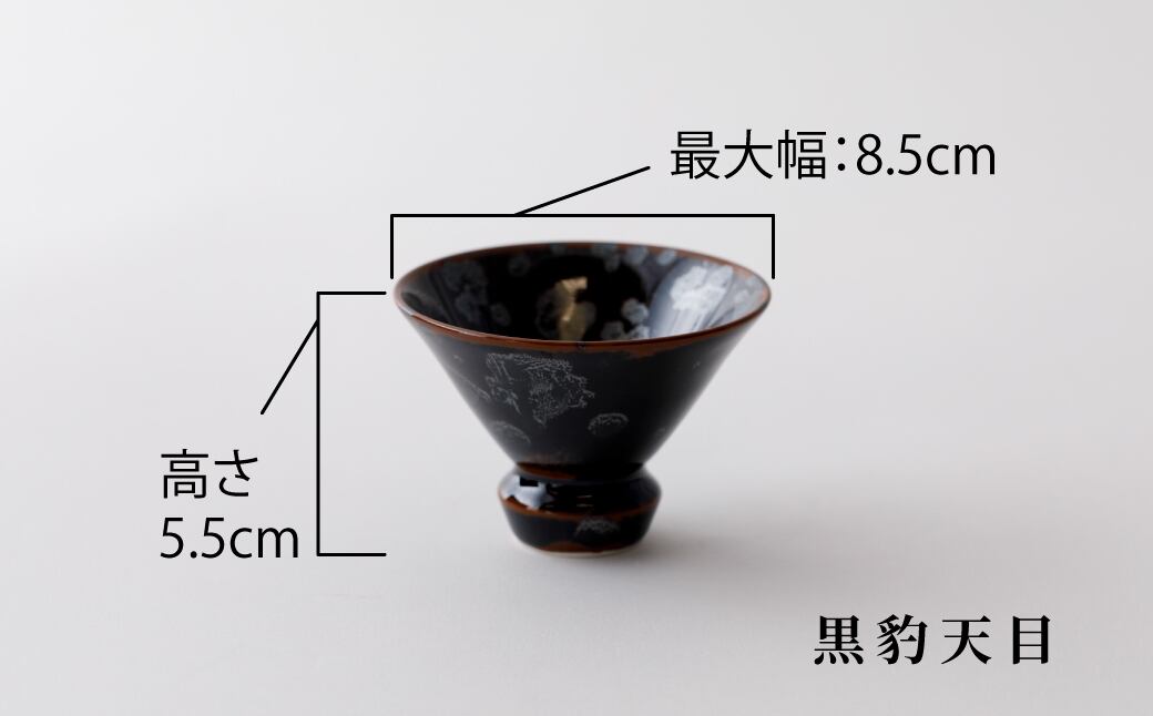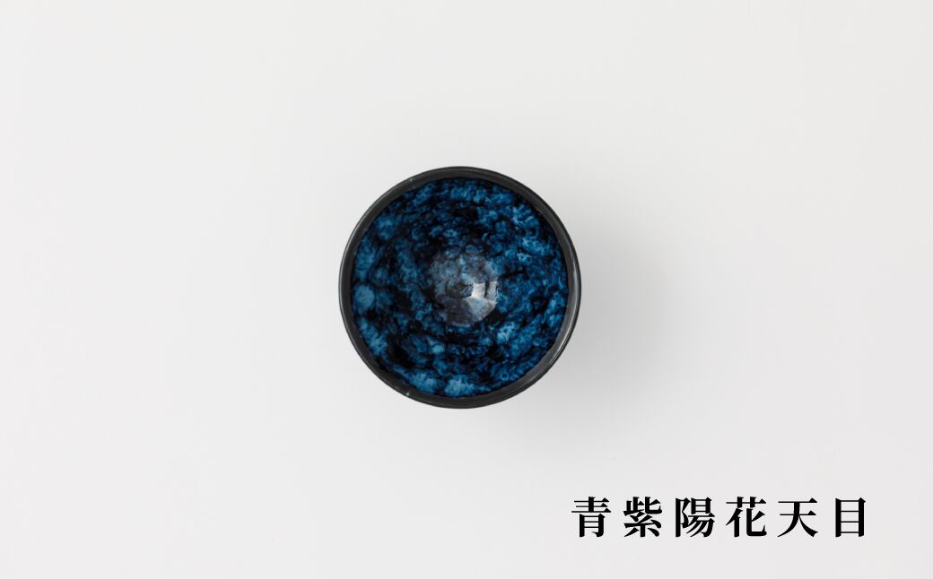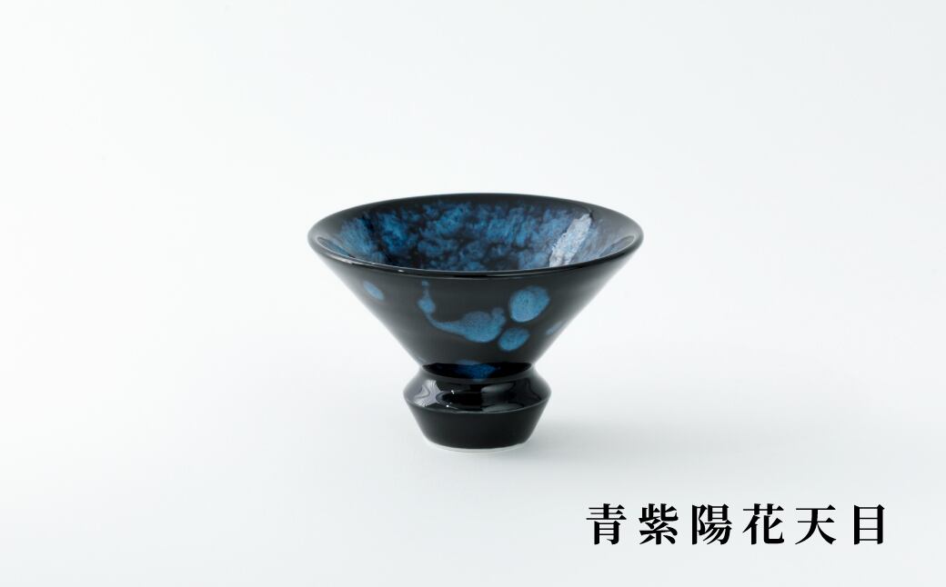 人間国宝を祖父に持つ井上祐希さんが、焼き物づくりでこだわっているのは「制御できない揺らぎの美しさ」です。近年は、釉薬による模様の表現でも、一つ一つ個性を持った揺らぎのあるものの魅力を引き出すことに力を注いで創作活動をしています。天目銀滴とも呼ばれる黒豹天目は、井上さんが2019年ごろからつくっているオリジナル。宇宙を感じさせるような奥行きのある神秘的な模様です。青紫陽花天目は釉薬の実験で偶然生まれた模様で、紫陽花のようなとても美しい発色のブルーです。攻めた造形の高台とエッジの効いた全体フォルムも魅力的。食前酒を入れるシェリーグラスやぐい呑みとしてもお使いいただけます。