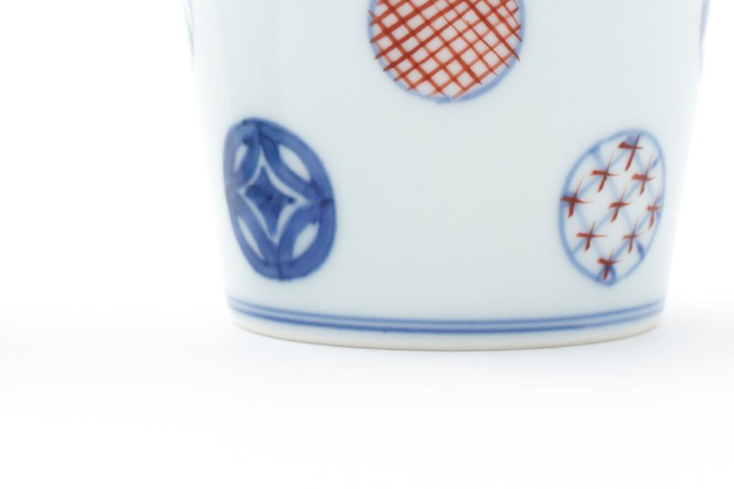 全国の蕎麦店で使われ、有田焼の中でも「蕎麦猪口と言えば渓山窯」として知られる名窯。1000種類以上もある中から選りすぐったこの蕎麦猪口には、様々な意匠の丸紋が染付と色絵で楽しく描かれています。一本一本手描きされているので、“手しごとの自由な線”が見てとれます。