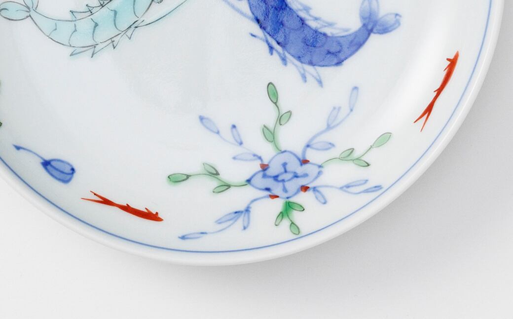 こちらは“古染付の海老”にヒントに、現代のエッセンスを加えた双海老(つがいえび)の5寸皿です。繁栄や長寿の願いを託した、縁起の良いモチーフのひとつで、「つがいえび」の読み名からもわかるように「ずっと夫婦仲良く健康で」というメッセージも込められています。銘々皿にぴったりサイズの5寸皿。ぜひ日常の食卓でご利用ください。