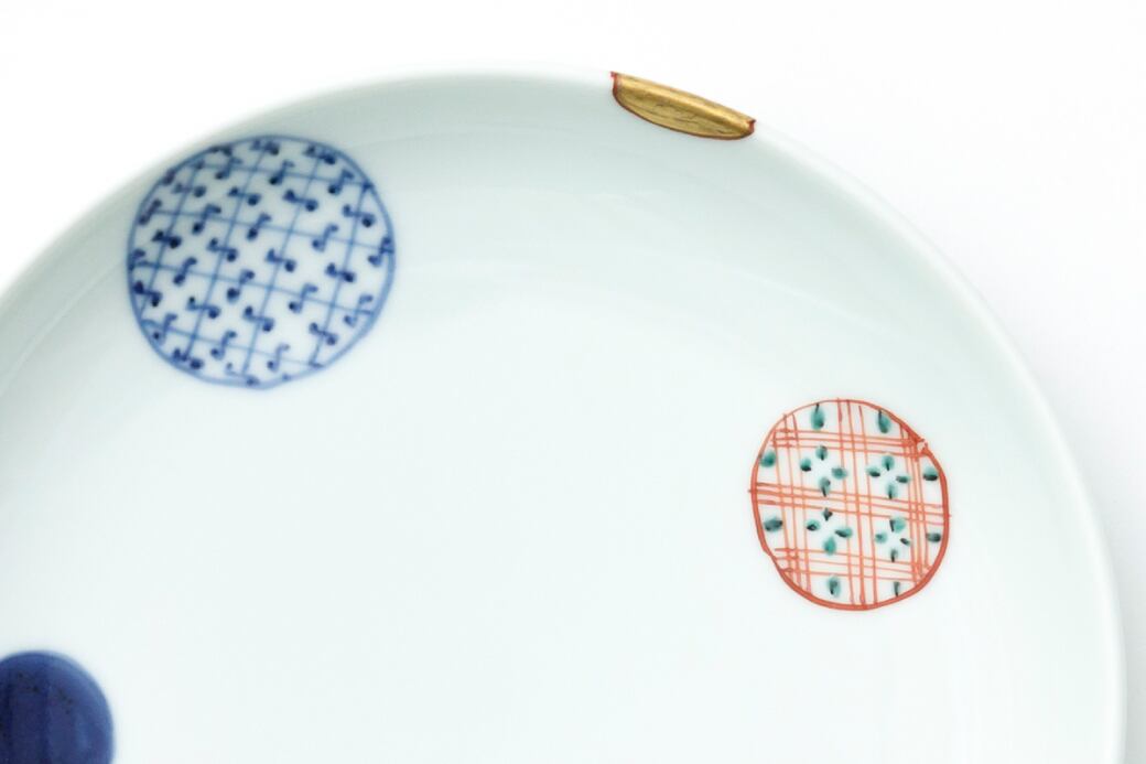 17世紀初頭に有田で焼かれた「初期伊万里」や、同時期に中国の景徳鎮で焼かれた「古染付」の影響を受け、その作風を基本とする福珠窯。これは江戸初期に流行した「祥瑞色絵」を基にした、福珠窯の定番文様の皿です。散りばめられた大小の円の中に、いくつかの地紋がかわいらしく描き込まれています。日々の食卓で、銘々皿などにご活用ください。