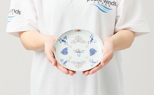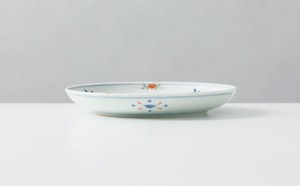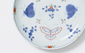 17世紀初頭に有田で焼かれた「初期伊万里」や、同時期に中国の景徳鎮で焼かれた「古染付」の影響を受け、その作風を基本とする福珠窯。これは中国の明代末、天啓時代に景徳鎮の民窯で焼かれた「天啓赤絵」をモチーフにした、福珠窯の定番文様の皿です。染付と赤絵でふわりと優しく花と蝶が描かれています。日々の食卓で、銘々皿などにご活用ください。