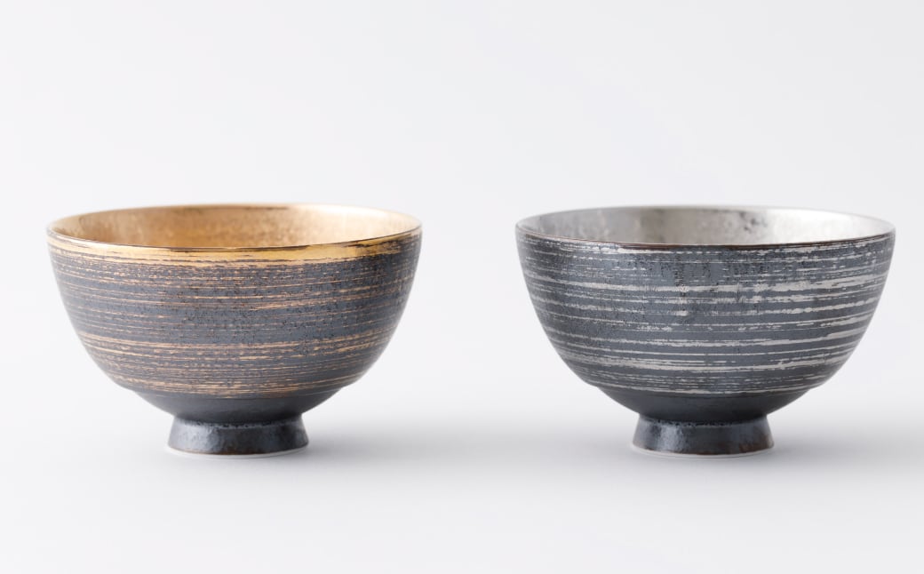 開窯以来380年以上もの長い歴史を持ち、伝統技術と現代生活にマッチしたデザインを掛け合わせた良質なモノづくりに邁進する陶悦窯が製作した外刷毛内金銀の対飯碗です。碗の外側は刷毛目の模様で目を楽しませてくれます。碗の内側はそれぞれ金一色、銀一色に塗られた素敵なしつらえになっています。お祝い事のギフトとしてもお使いください。普段づかいしていただければ、毎日の食卓を華やかに飾ってくれます。