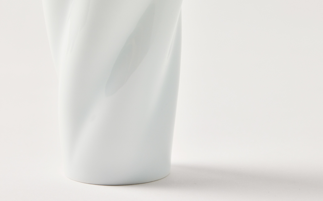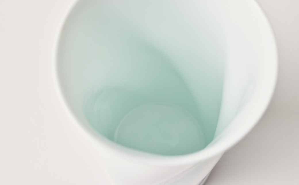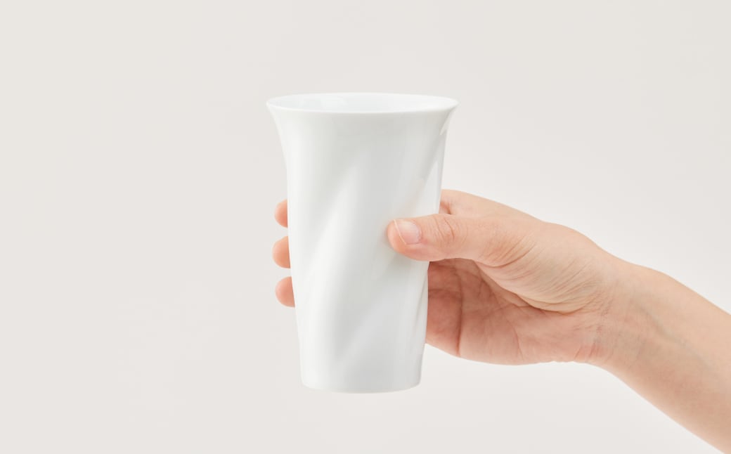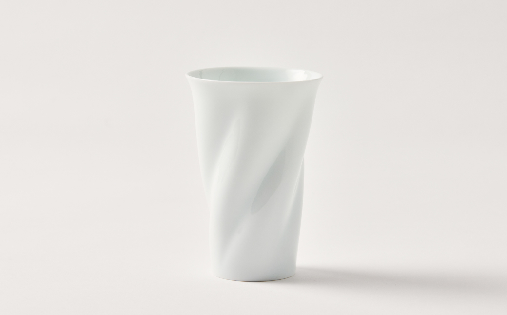 陶芸作家の中尾恭純(やすずみ)さんの息子、中尾純さんの作品です。ろくろ成形後、柔らかいうちに指で押して形を変形させて製作されたカップです。美しい白磁の素地を生かしながら、まるでカップ自体が胴をひねっているように表現されています。その姿は、手作業で行われているとは想像がつかないほど狂いなく美しく、荘厳な匠の技を想わせます。氷もたっぷり入るので、冷たいコーヒーや緑茶、ビアグラスとしてもお使いいただけます。飲み物を注ぐとお花の形が現れますよ。