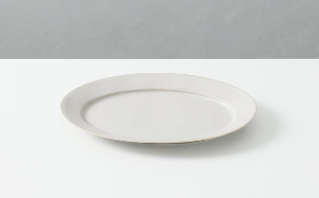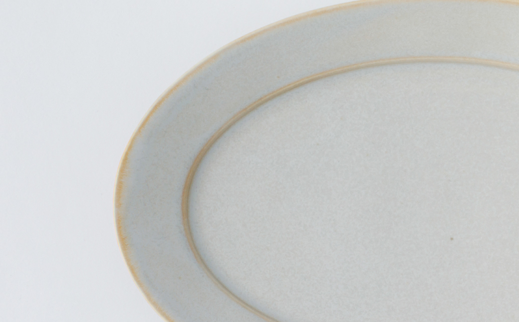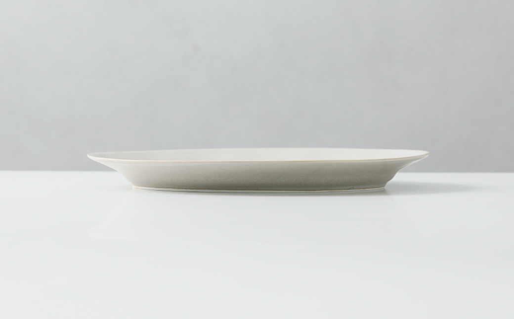 生活空間へ自然に溶け込み、「ほっと」気持ちがなごむような器づくりを目指して作陶を続ける皓洋窯が製作したシャーベットグレーのリム楕円プレートです。テストにテストを重ねて開発した釉薬「シャーベットグレー」は、マットとグロスの中間のような質感をつくり出し、見る角度によって変わる色味も楽しめます。暗すぎず、優しい雰囲気の”シャーベットグレー”。