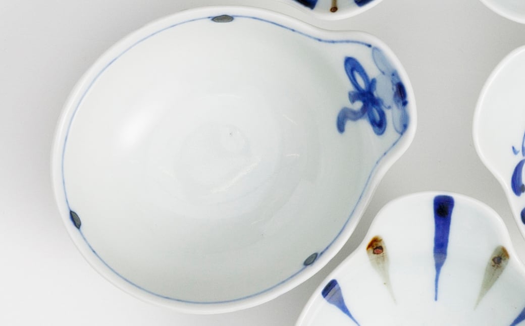 こちらは小さいとんすいのような、しずく型小付セットです。染付の5種類を集めました。小さな取っ手で持ちやすくなっており、薬味や珍味入れとして豆皿サイズでぴったり。れんげ置きとしてもご利用いただけます。おもてなしの席でも、家族でそれぞれ好きな絵柄を選んでも楽しいですね。