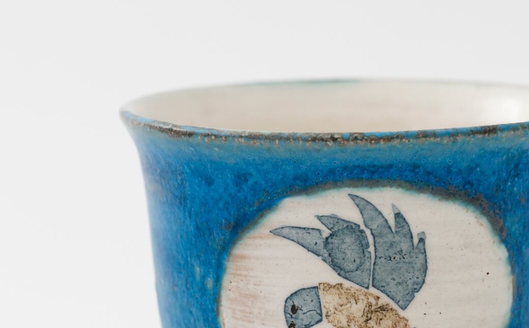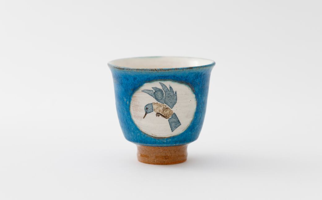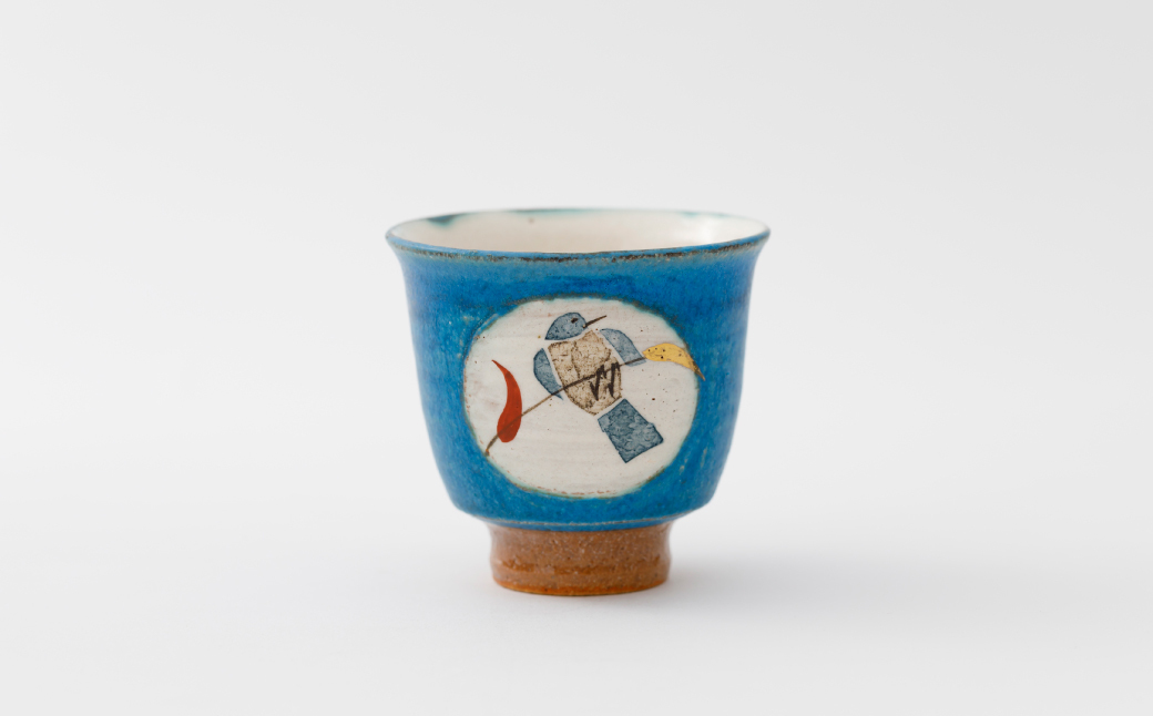 康雲窯は、「武雄古唐津」の伝統的な技法を継承しつつ、上絵・赤絵などをあしらい、華やかさを取り入れた「新しい武雄の焼物」の創出を目指す武雄焼の窯元です。この和紙染青い鳥煎茶湯呑は、沖縄での作陶経験がある華傳さんが手掛けた作品です。美しいブルーと色鮮やかな青い鳥の絵柄が印象的です。煎茶を注ぐと、お茶の緑と器のブルーが美しいコントラストをみせます。マットな質感で、手の収まりがよいのもうれしいポイントです。