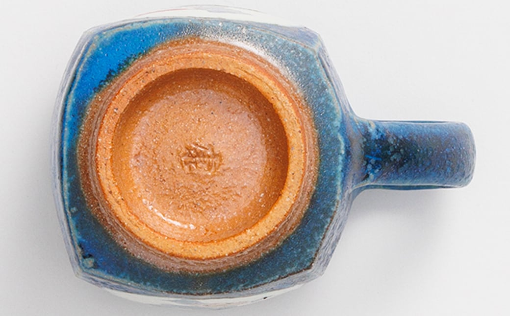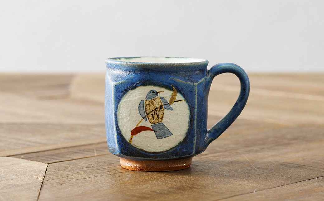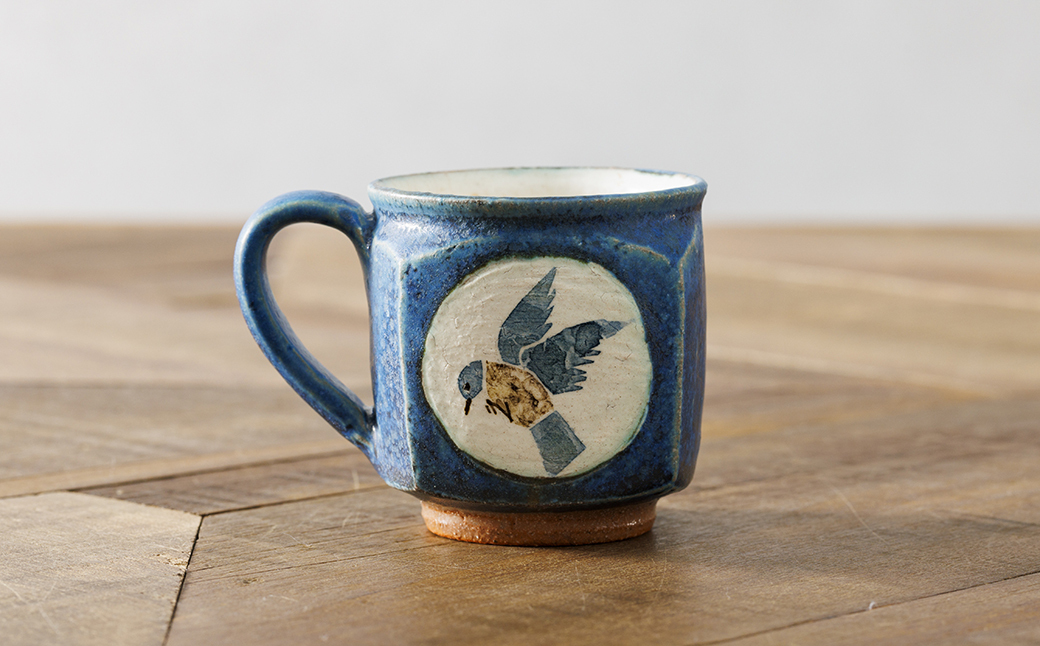 これは手に収まりが良く、使いやすいサイズのコーヒーカップです。仕事中やティータイムなど、日常の様々なシーンに彩りを添えてくれます。一つ一つ手づくりの味わいがあり、釉薬の青の濃淡が絵画のような重厚感を与えるアイテム。持ち手は使いやすいようにバランスを考えました。鮮やかな青色には、使う方の気持ちを明るくしたいという康雲窯の思いが込められています。 内側は白なので、コーヒーやお茶の色もきれいに映えます。愛らしい青い鳥も日々の生活を癒してくれます。和紙染めでひとつひとつ丁寧に描いています。手仕事の魅力がつまったアイテム。