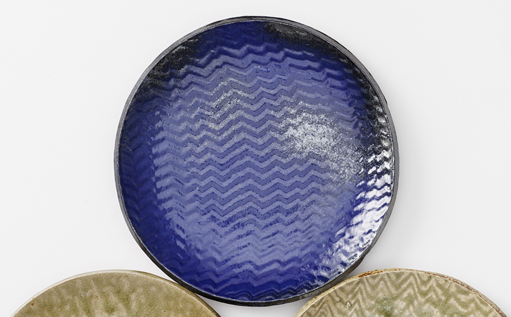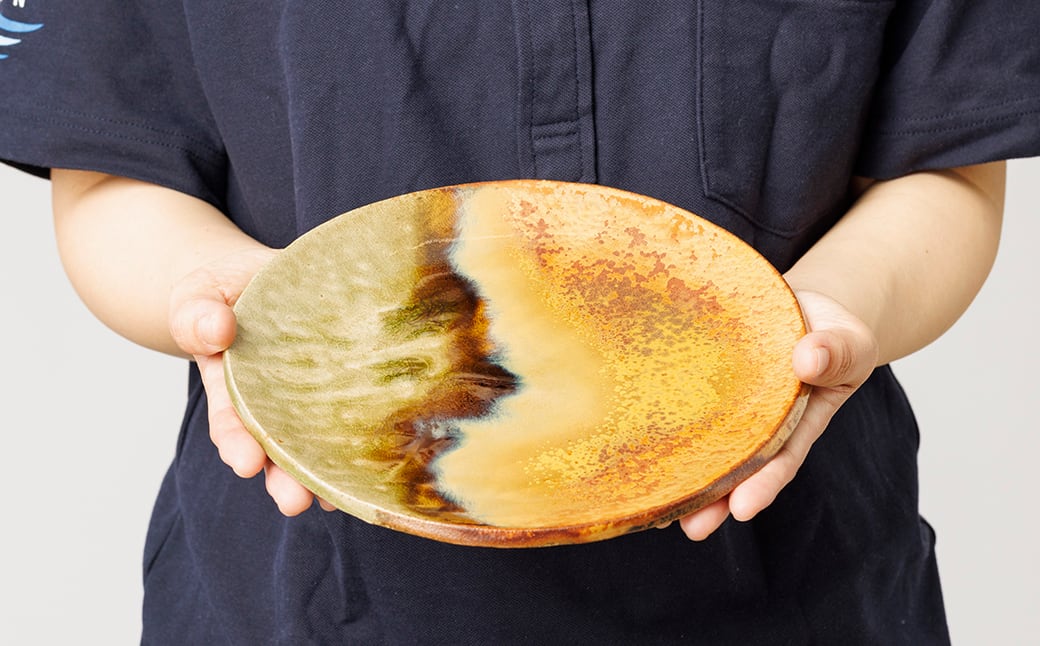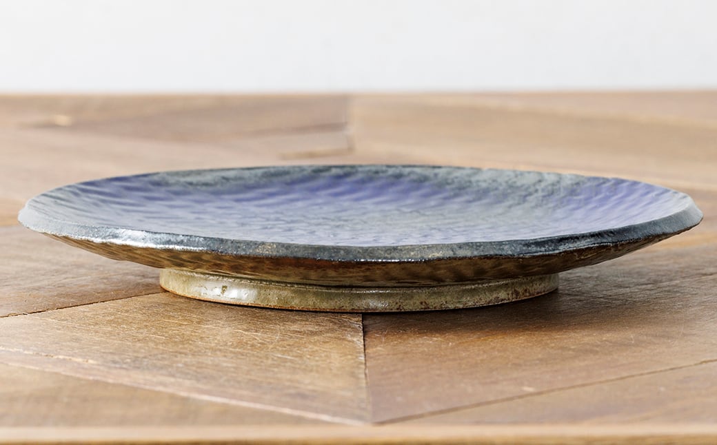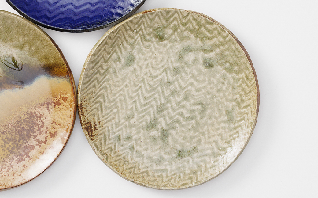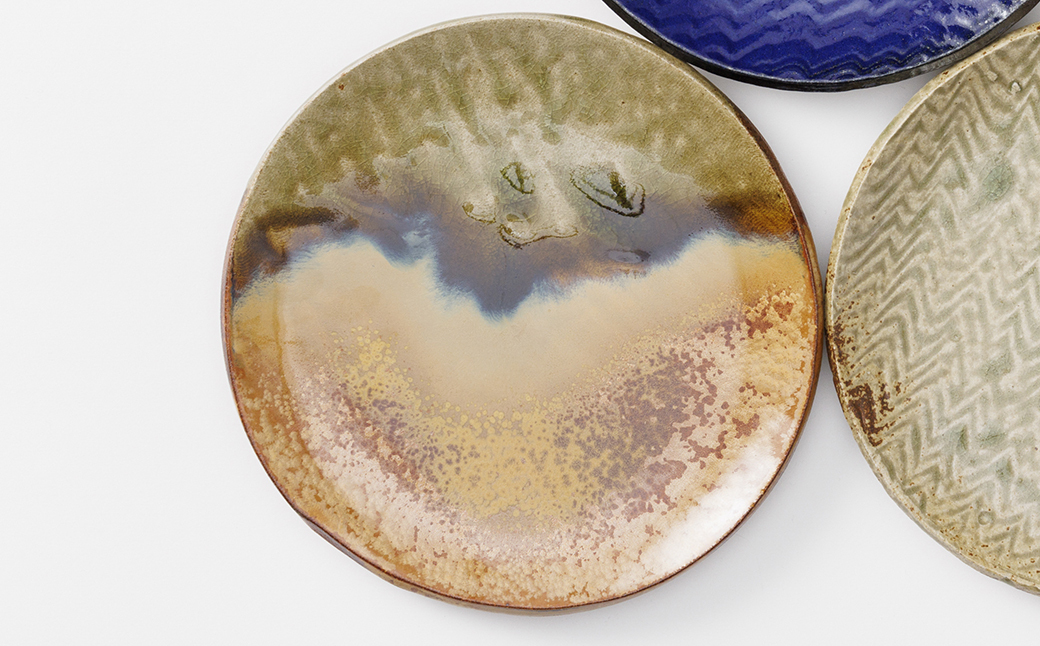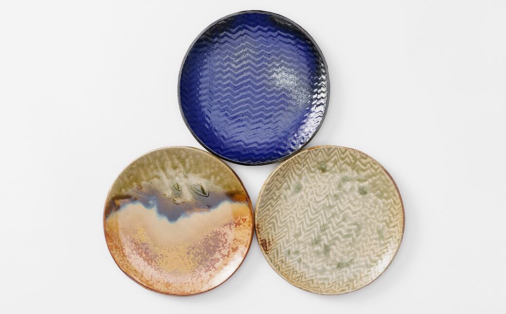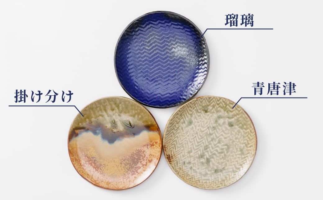 こちらは、それぞれ技法の違う七寸皿。掛け分け、青唐津、瑠璃の3種からお好きなものをお選びください。
