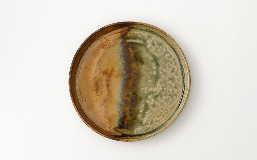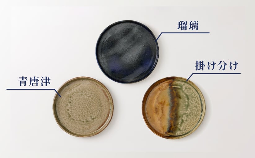 こちらは、それぞれ技法の違う七寸皿。掛け分け、青唐津、瑠璃の3種からお好きなものをお選びください。