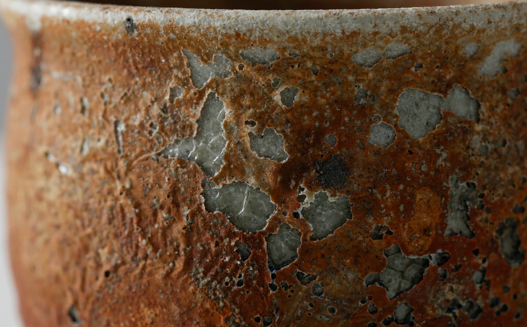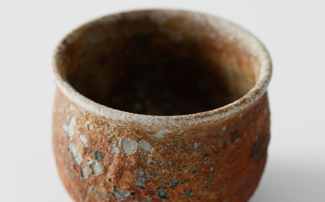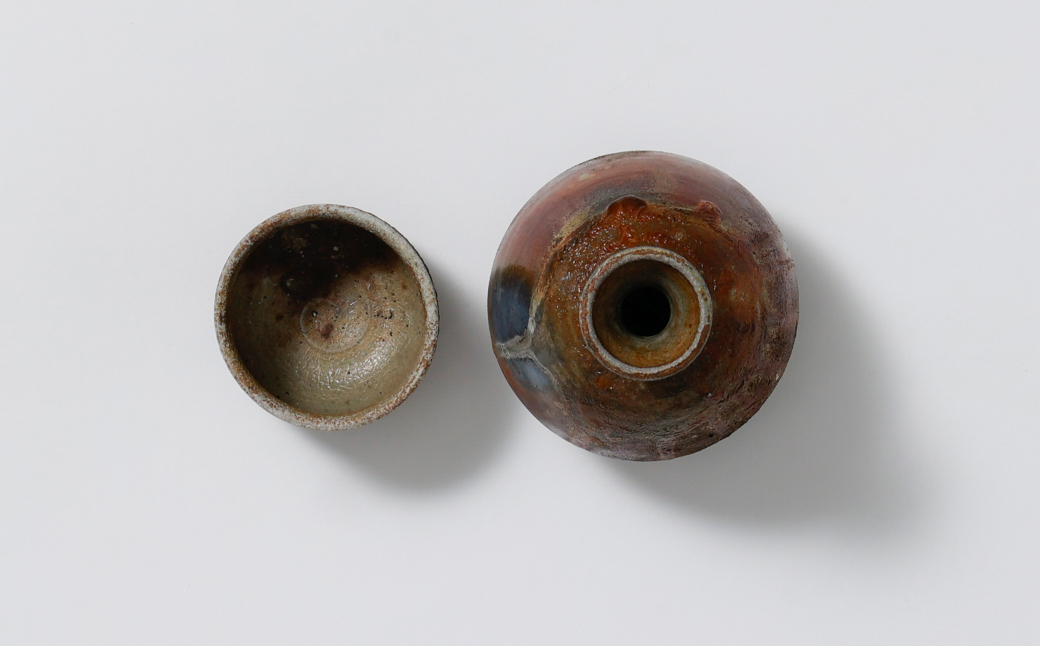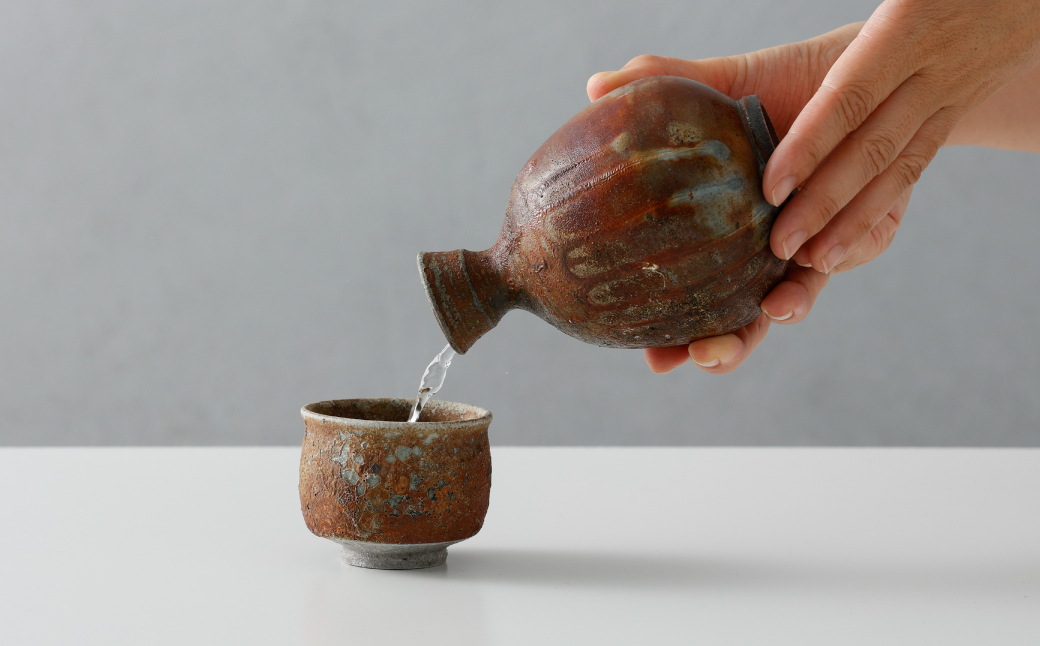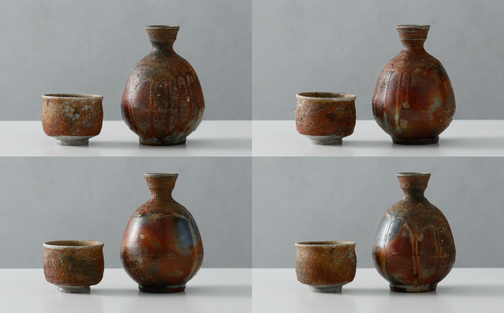 こちらは、独特の手ざわりと表情が魅力の、灰かぶりぐい呑みと徳利のセットです。登り窯で灰をかぶせて焼成の際に一気に温度が上がってできたぽつぽつとしたふくらみがあり、格好良さを引き立たせています。狙ってできるものではないため、手作りならではの味わいをお楽しみください。