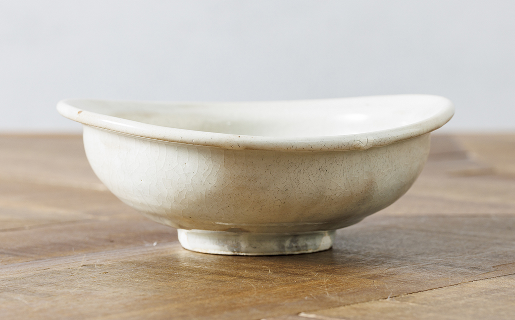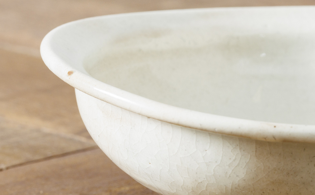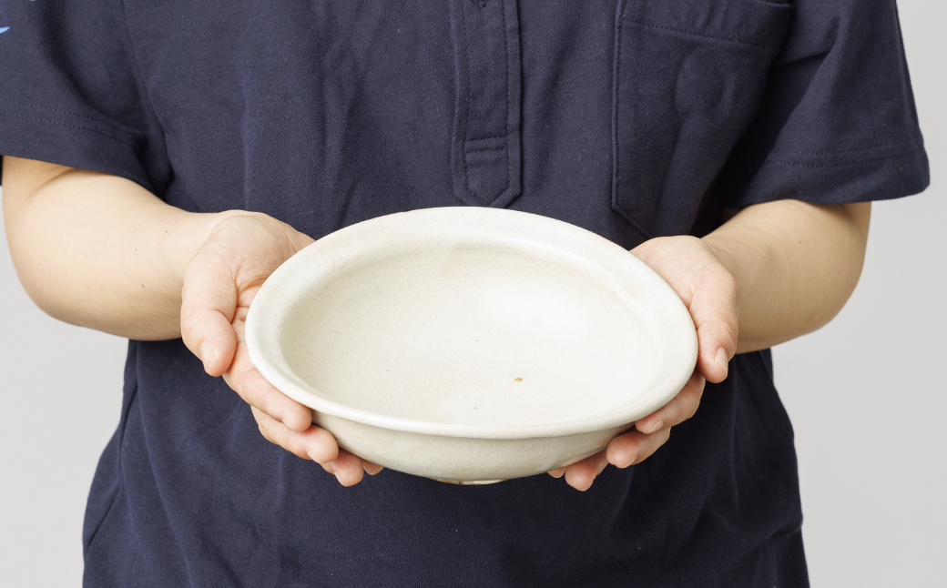 こちらは、全体に入った貫入が美しい、粉引きのリム鉢です。少し大きめの鉢で、深さもあるためスープやサラダ、おかずを入れたりと、何にでも使える万能サイズ。ゆがんだ縁が味わい深く、粉引きのほっこりした色合いで、入れるものを選びません。ぜひ毎日の食卓でご利用ください。