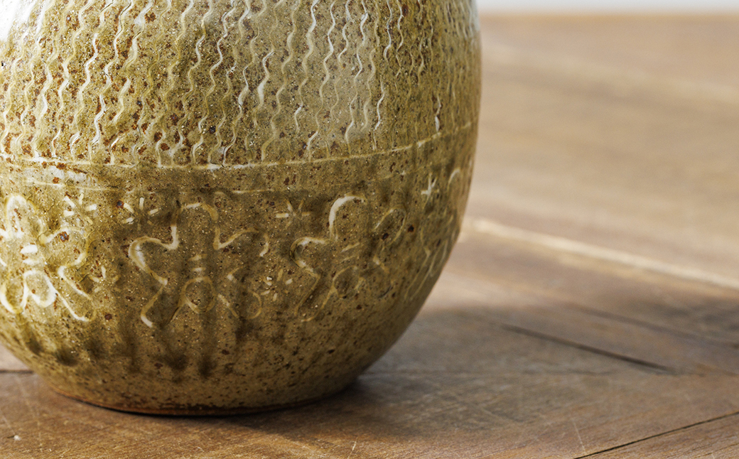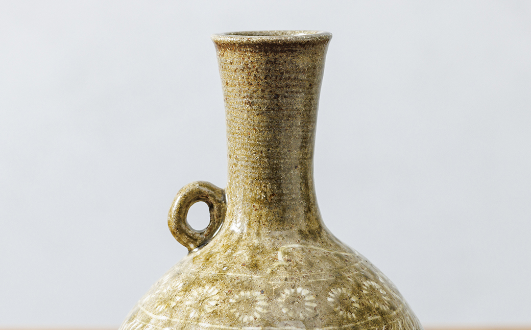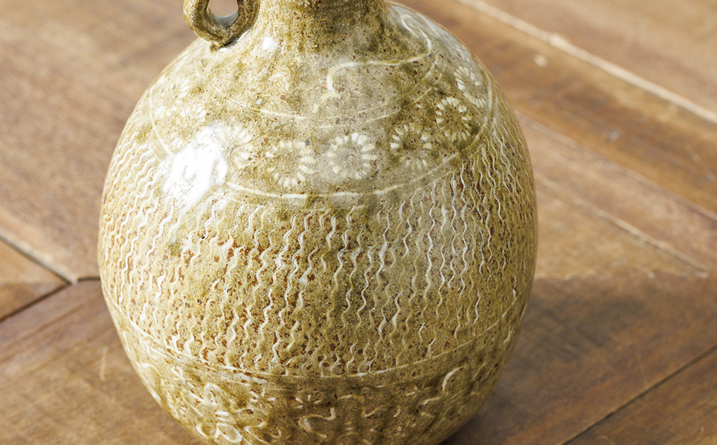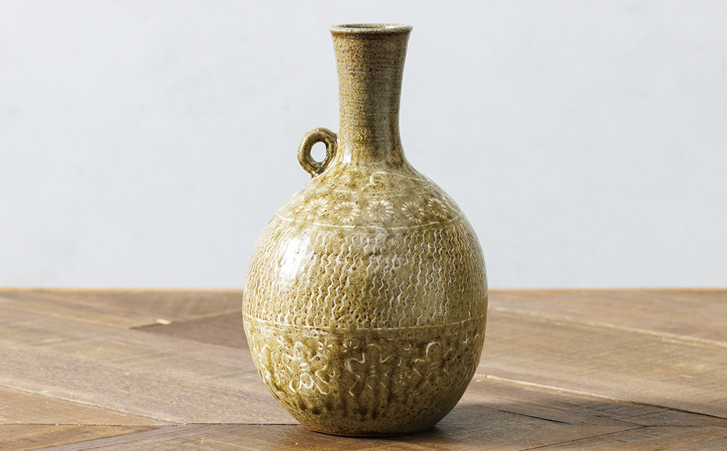 こちらは、青唐津の格好良さの中に象嵌の花柄が可愛らしい花器です。ころんと丸いフォルムに花柄の象嵌が押されており、くびれ部分についた飾りの耳が可愛らしいこちらの花入れ。灰釉でつくられた青唐津の釉薬が、流れて色の濃さがまだらになっているのも手づくりならではで、ひとつひとつの味となっています。青唐津のしっとりした色味で主張しすぎず、どのお花にもあうでしょう。