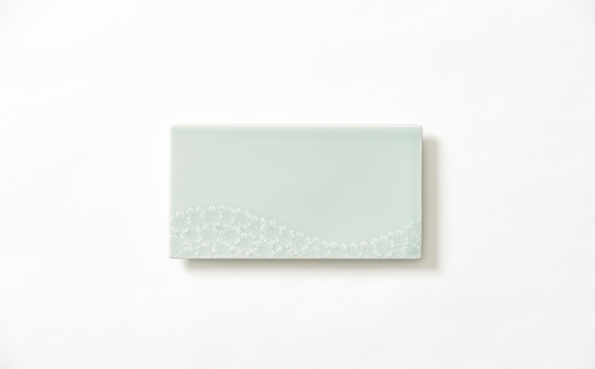 触れた瞬間に優しさが伝わる気品あるマット青磁の質感。その、しっとりとして優しい表面処理は伊万里焼の畑萬陶苑の独自技術。川の流れに浮かんで流れていく桜の花を連想させる姿がとても美しい長角皿です。料理からデザートまで、何を盛っても絵になる使い勝手のよい皿です。料理の色がとても映えて食事の楽しみも数段アップします。フラットな皿ですが、少し奥まった位置に高台がありますので、持ちやすく工夫されています。ペアでぜひどうぞ。