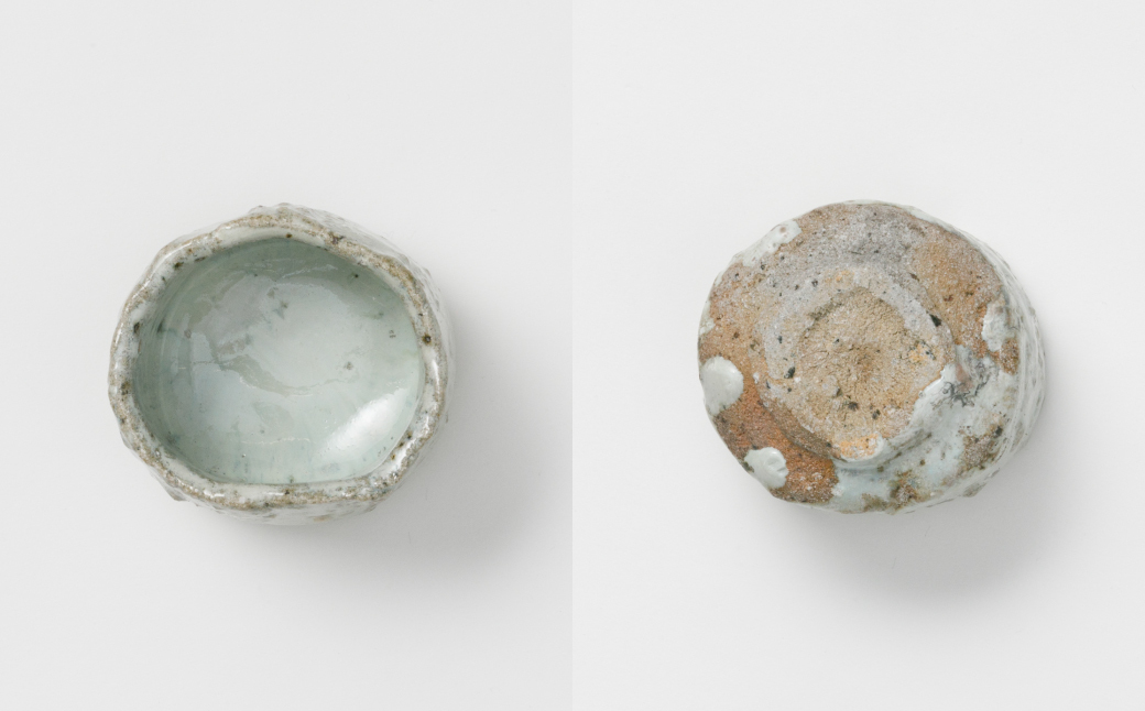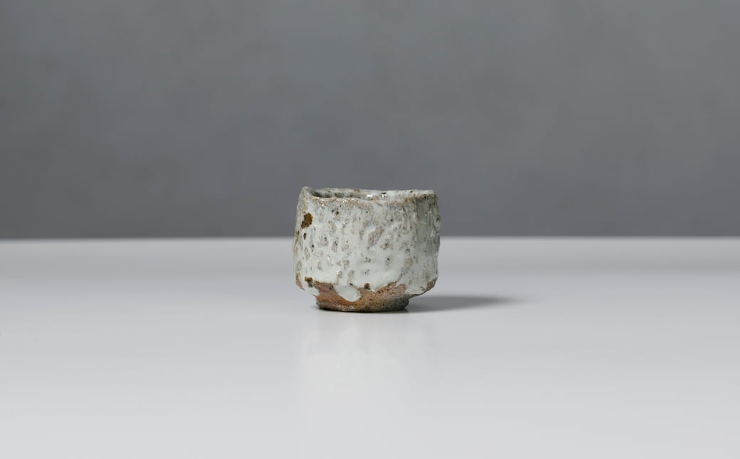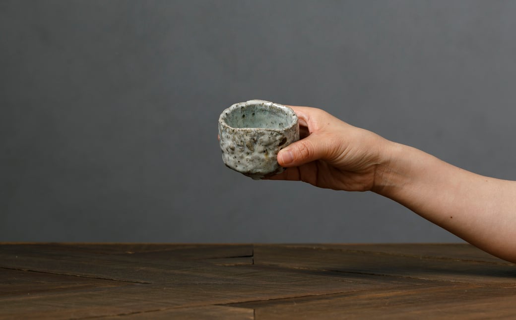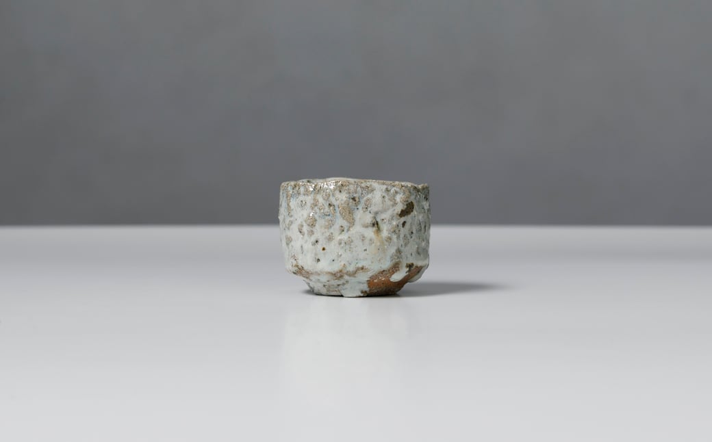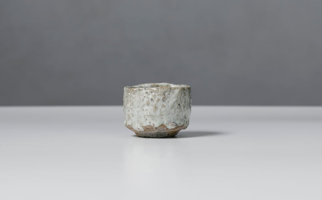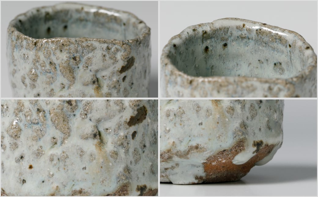 斑唐津とは、たっぷりと掛けられた乳白色の藁灰釉の間に土に含まれる鉄分がポツリポツリと現れることから名づけられました。ロクロ成形ではなく唐津焼では珍しい刳貫(くりぬき)技法で時間をかけて丹念に製作されています。ロクロとは異なる形状も魅力のひとつです。見込みや側面の釉薬の景色や、ごつごつとした唐津の土味など、随所に見応えがある一品。器とお酒に酔いしれるでしょう。