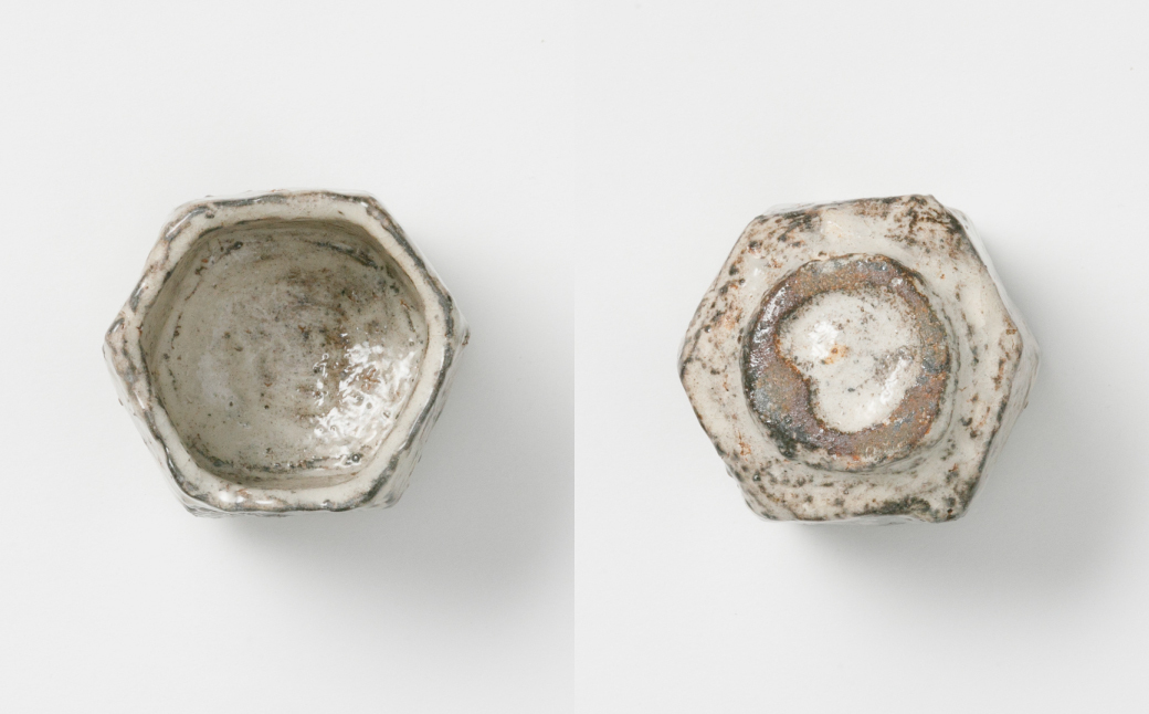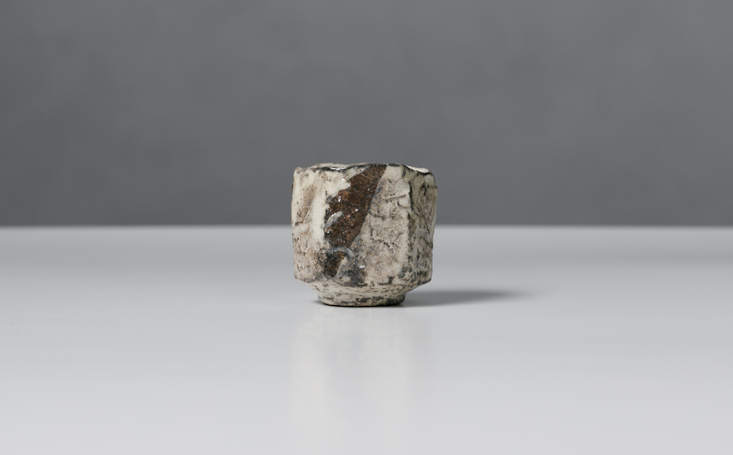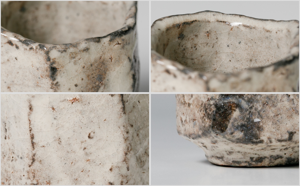 褐色部分は、釉薬がかかっていない、土が露出したところで火間(ひま)と呼ばれます。窯入れの際、素地が露出している部分だけが焦げ、趣のある褐色へと変化しています。釉薬が施された部分は、粉引ならではの優しい乳白色になっています。ひとつの器で様々な景色をお楽しみいただける一品です。また、ロクロ成形ではなく唐津焼では珍しい刳貫(くりぬき)技法で時間をかけて丹念に製作されています。
