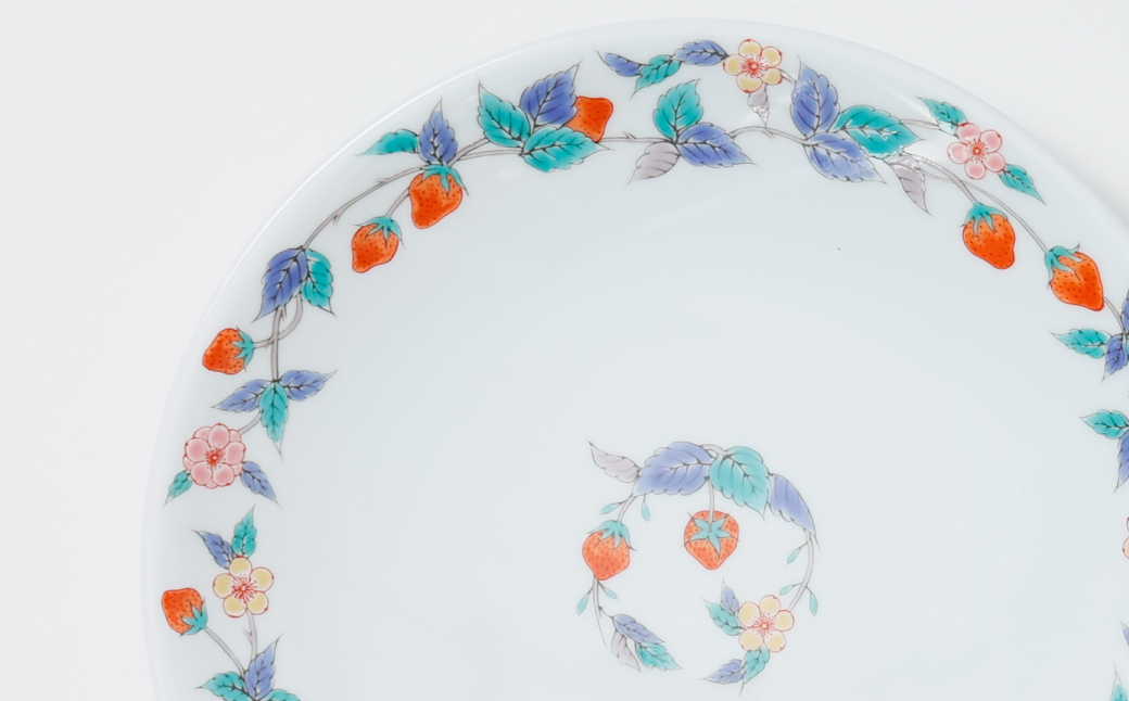 【 検索ワード 】有田焼 食卓で使う 磁器 丸皿 大皿 草花 文様 可愛い おしゃれ いちご 植物柄 ラウンドプレート