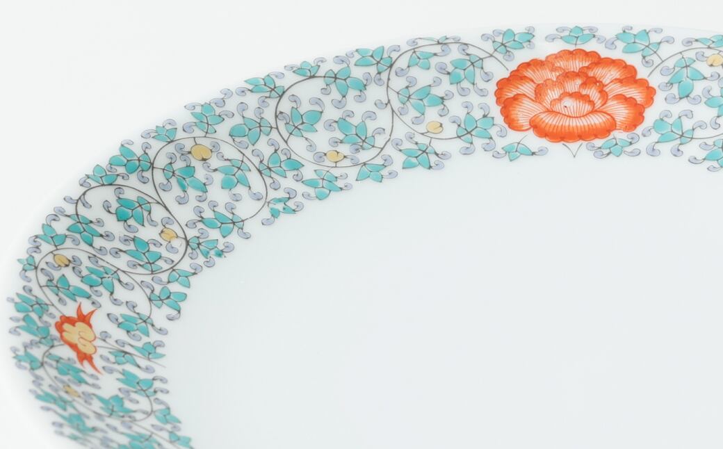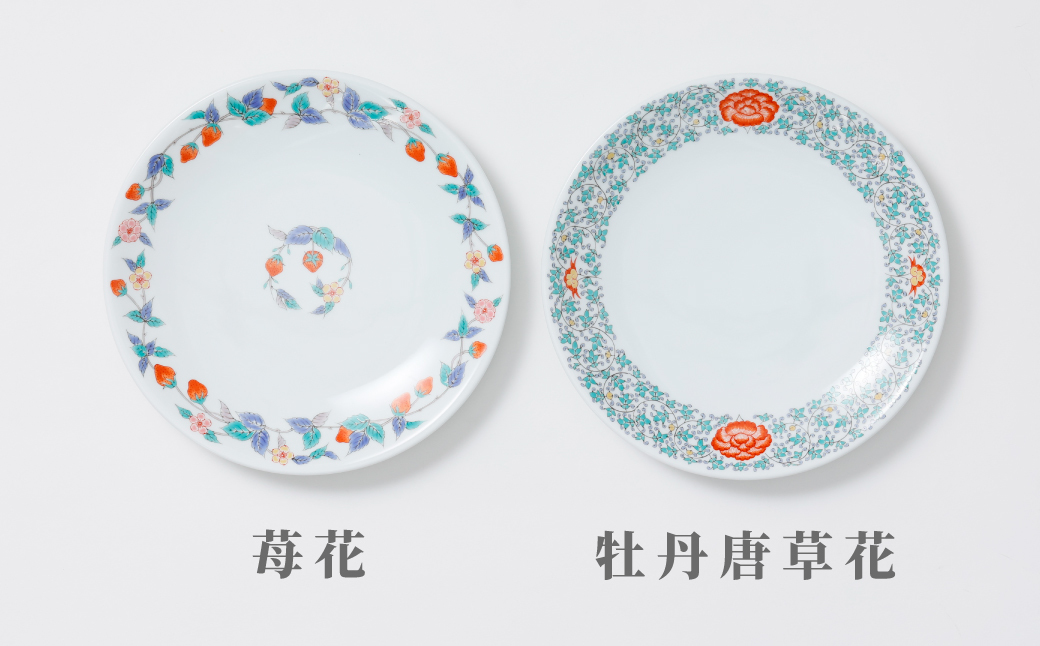 窯元伊兵衛は、延宝様式(17世紀に完成した余白を活かした上絵付が特徴の様式)に独自の手法を融合させ、機能性の高い普段使いの器から繊細で美しい工芸品まで幅広く作陶を続ける窯元です。錦牡丹唐草花皿の縁部分には、鮮やかな牡丹と細かな唐草が施されています。オリエンタルな雰囲気も感じさせ、食卓をおしゃれに彩ることでしょう。錦苺花皿は、縁部分と中央部に有田焼らしい鮮やかな配色の苺が描かれています。苺のモチーフやお花のような形状が可愛らしさを感じさせます。どちらも想像以上に軽いのも魅力で、日常使いにぴったりです。ハンバーグやステーキなど、メイン料理のプレートにどうぞ。