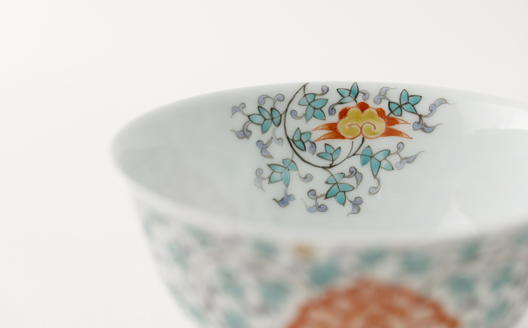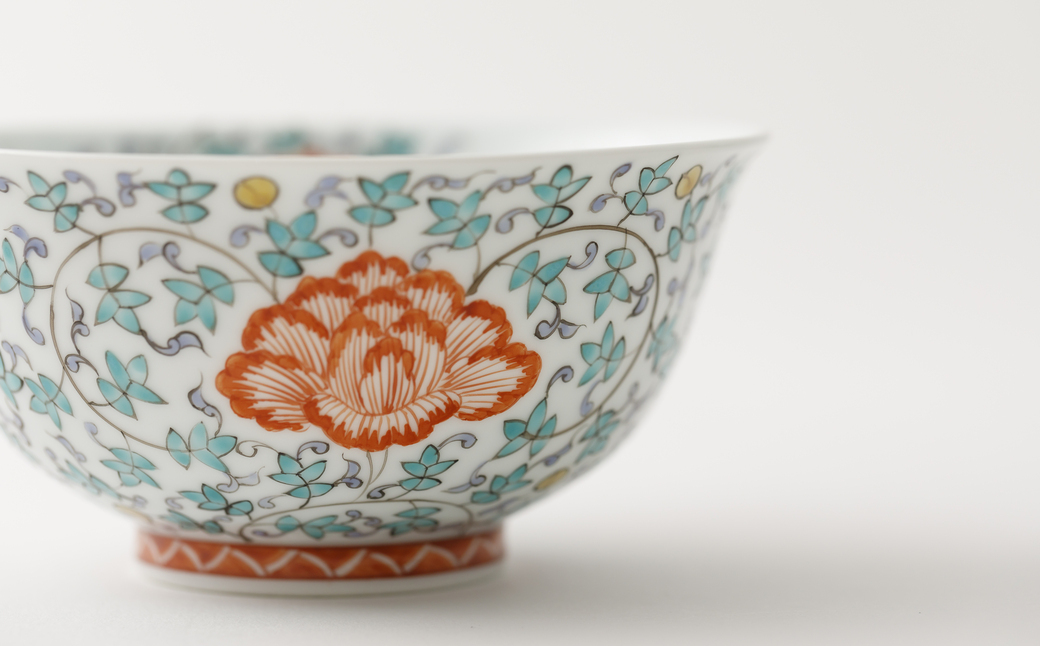 窯元伊兵衛は、延宝様式(17世紀に完成した余白を活かした上絵付が特徴の様式)に独自の 手法を融合させ、機能性の高い普段使いの器から繊細で美しい工芸品まで幅広く作陶を続ける窯元です。このご飯茶碗は鮮やかな牡丹と繊細な唐草柄が特徴です。奈良時代に中国から伝えられた高貴な紋様として知られる牡丹の花が、内外の側面に施されています。高台の青海波や縁の唐草など、細部にまで施された絵柄は全て手描きで製作された一級品です。磁器ならではの軽量さですが、程よい厚みで持ちやすくつくられています。長寿のお祝いにも喜ばれる逸品です。