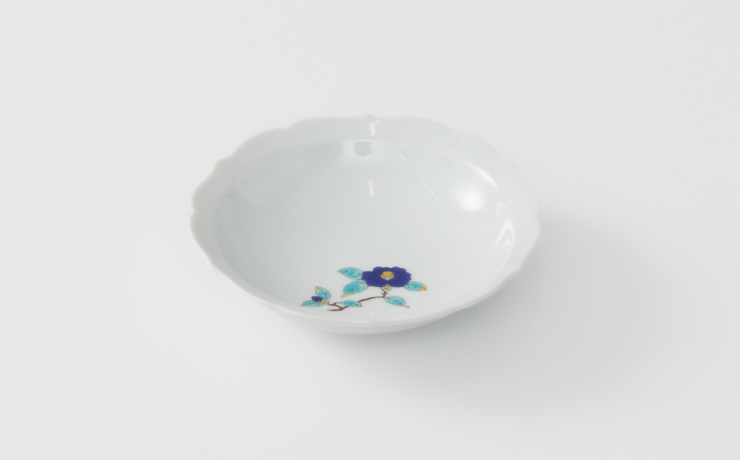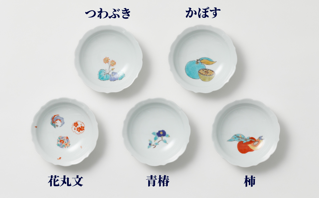 この「三寸輪花深皿」は、鮮やかな花や果物のデザインの中から【花丸文・青椿・柿・かぼす・つわぶき】の5枚をセレクトし、セットにしています。伝統的な絵柄に、現代的なポップさを加えたデザインが食卓に彩りを添え、その日の気分に合わせてお使いいただけます。深さのある小皿なので、醤油皿やお漬物皿としてだけでなく、かわいらしい形状を活かしてアクセサリーや小物置きとしてもご利用いただけます。