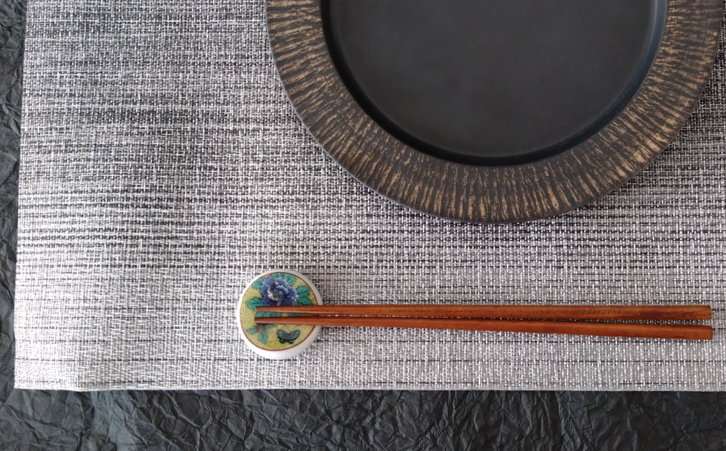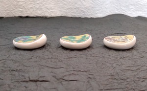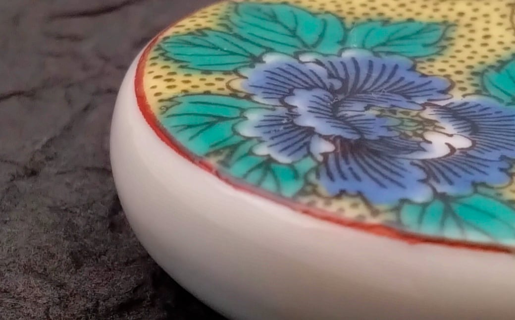 九谷焼は江戸時代初期から生産されてきた陶磁器です。陶石が発見され、産地となった九谷村にちなんで「九谷焼」と呼ばれます。赤、青、黄、紫、紺青の五彩を用いた「古九谷」や青、黄、紫、紺青の四彩を用いた絵柄が特徴の「吉田屋」、赤で緻密に人物と小紋を描く「飯田屋」、古九谷・吉田屋・赤絵・金襴手のすべての手法を取り入れた「庄三」、花や金をあしらった「花詰」など様々な作風があります。こちらは吉田屋の手法で作られた箸置きです。箸が転ばないようにくぼみや角度が付いています。