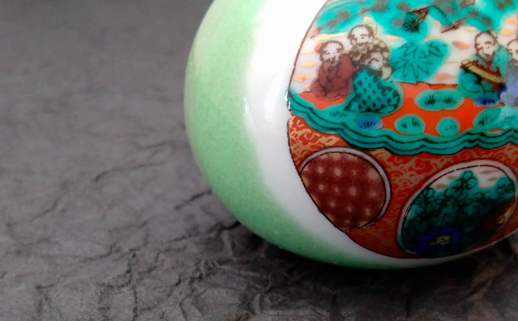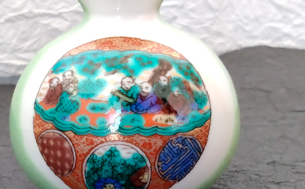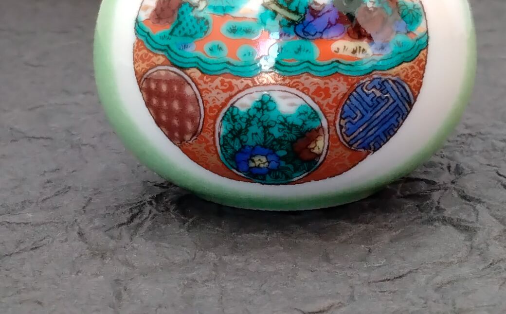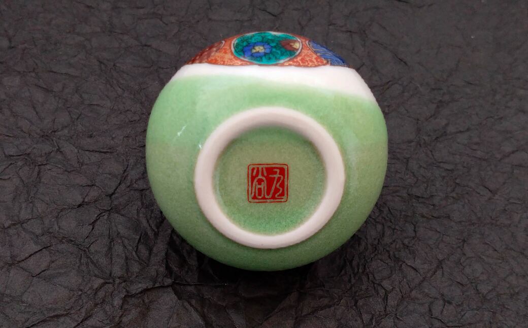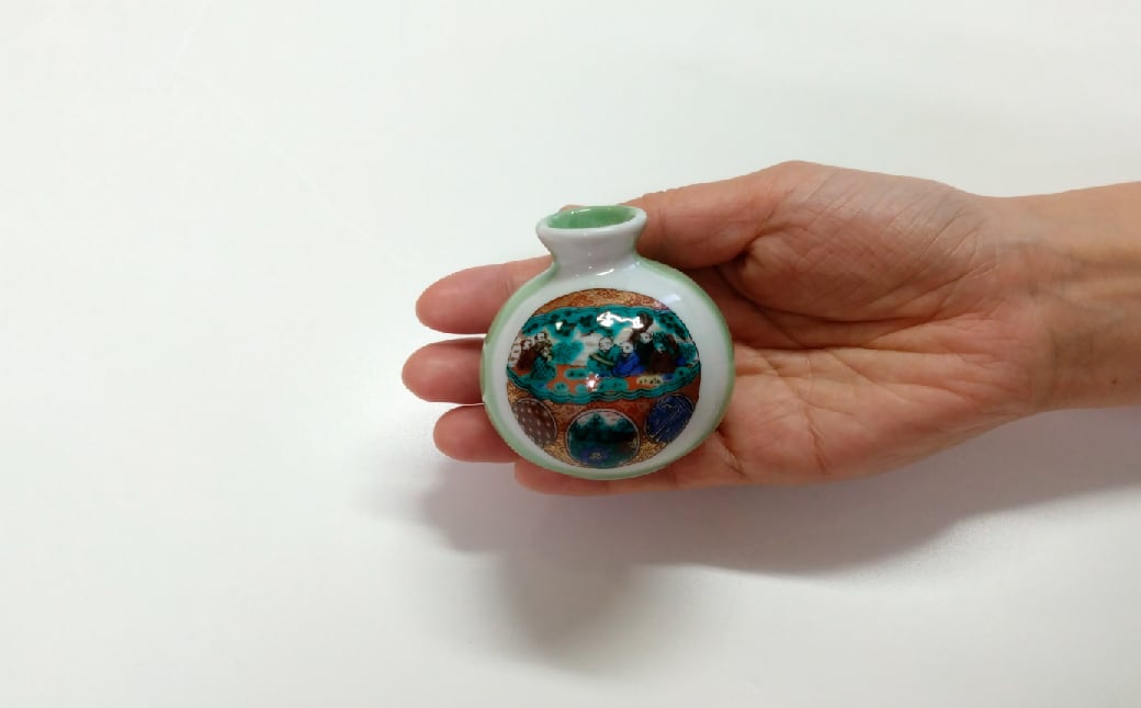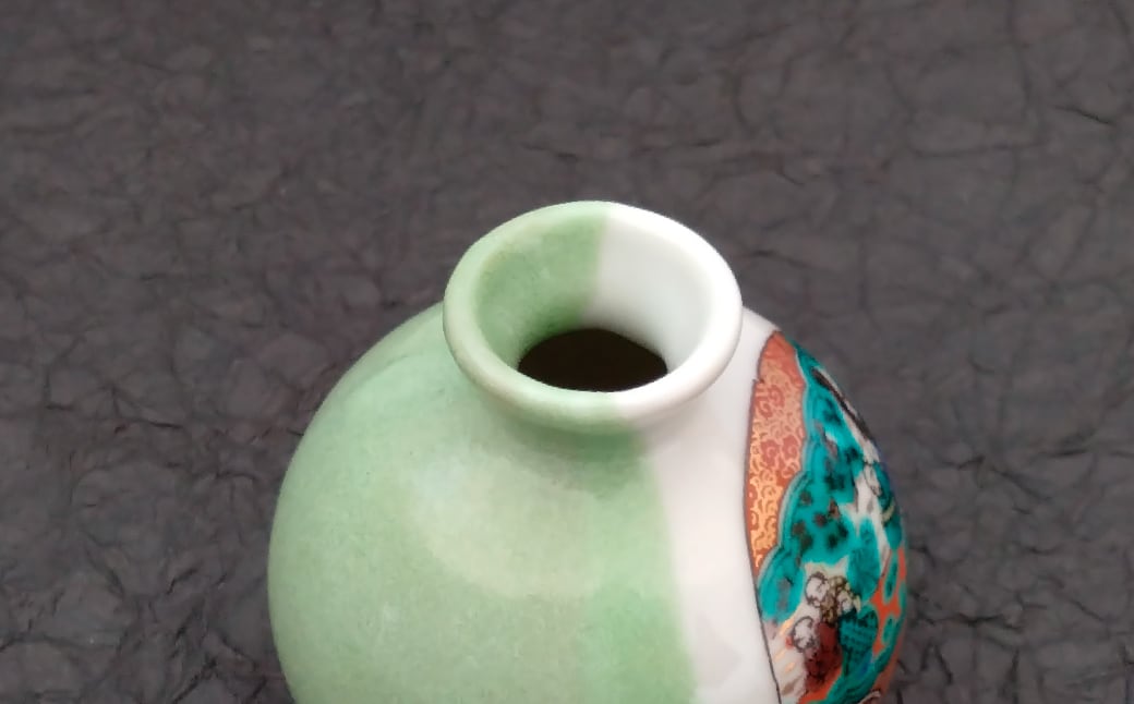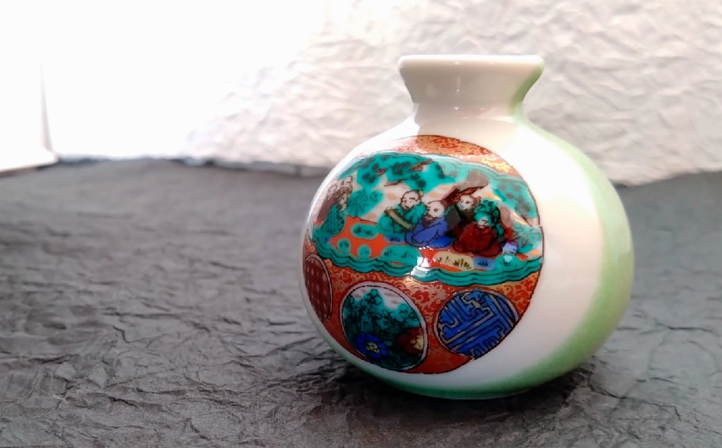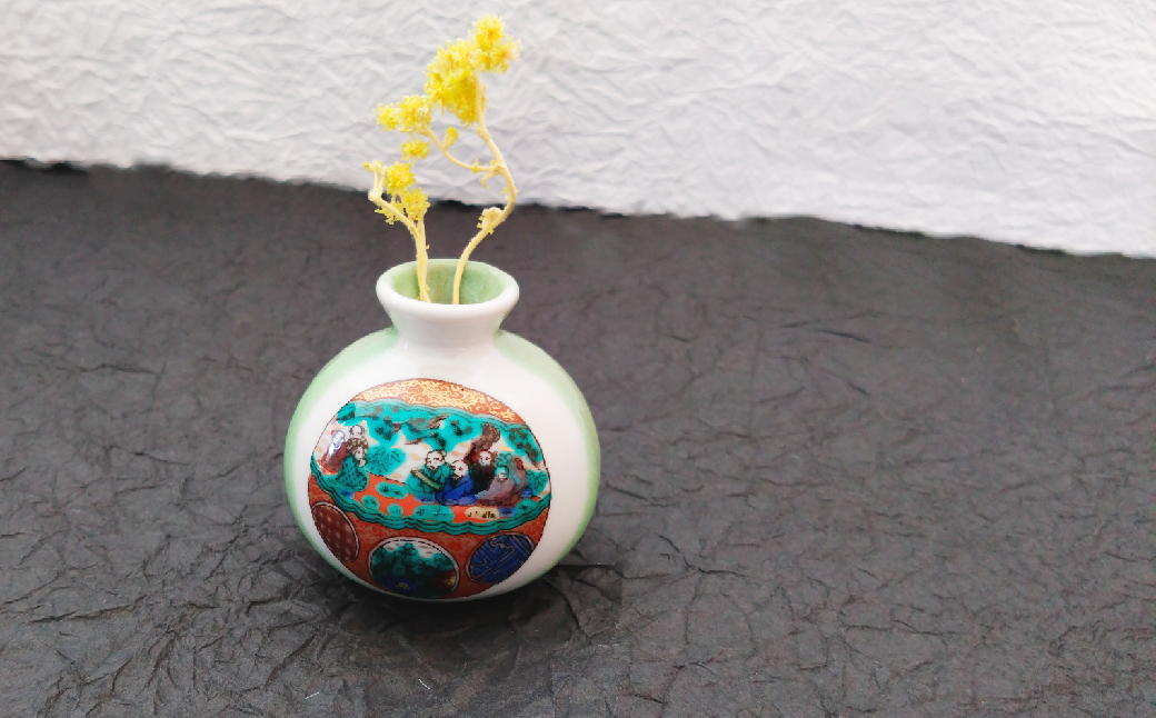九谷焼は江戸時代初期から生産されてきた陶磁器です。陶石が発見され、産地となった九谷村にちなんで「九谷焼」と呼ばれます。赤、青、黄、紫、紺青の五彩を用いた「古九谷」や青、黄、紫、紺青の四彩を用いた絵柄が特徴の「吉田屋」、赤で緻密に人物と小紋を描く「飯田屋」、古九谷・吉田屋・赤絵・金襴手のすべての手法を取り入れた「庄三」、花や金をあしらった「花詰」など様々な作風があります。こちらは庄三の手法で作られた一輪挿しです。ころんとした丸みと色鮮やかな柄が特徴的です。