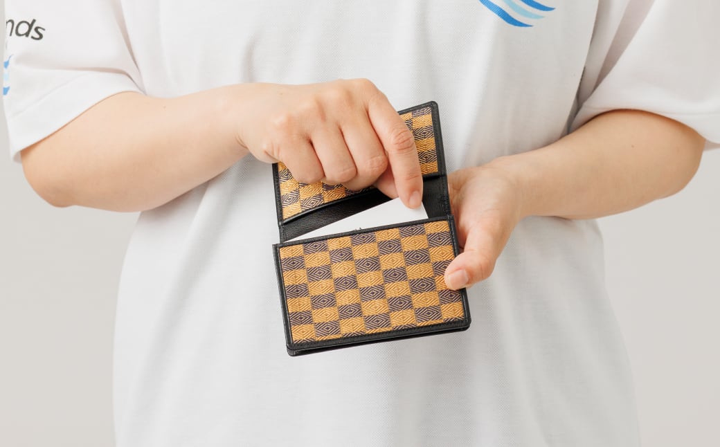 佐賀錦は、金・銀・漆を貼った特製の和紙を細く裁断したものを経糸、絹のより糸を染色したものを緯糸として織り上げられる佐賀県の伝統工芸品です。このカードケースは佐賀錦振興協議会とプロダクトデザイナーの澄川伸一さんとのコラボレーションにより誕生しました。外側には牛革を使用し、内側に佐賀錦を張り込むことで、佐賀錦の摩耗を防ぐ工夫をしています。名刺入れとしてもご使用いただけます。開いたときの華やかさは多くのかたの印象に残ることでしょう。ご購入後は専用の化粧箱にお入れしてお届けしますので、大切なかたへのプレゼントにもおすすめです。